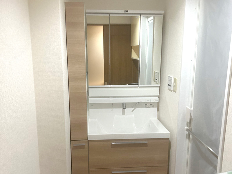 当初は洗面台の交換をご希望されていませんでしたが、現地調査の際に「収納力がアップする2段スライド収納」「スマートポケット収納」「トールキャビネット」をご提案しました。